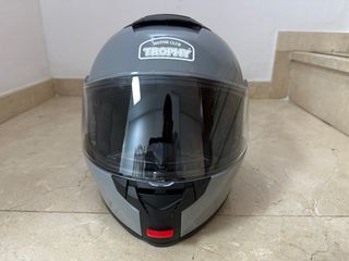 Casco de moto marca Trophy, modelo flip-up, en color gris. - Diseño integral. - Visera transparente.
