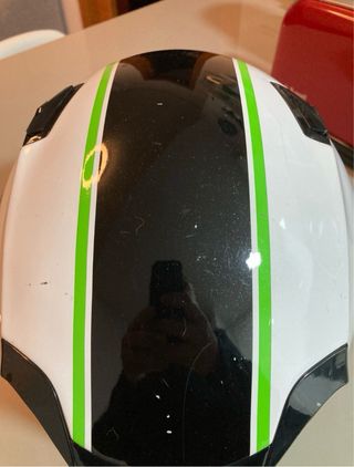 Casco integral X-Lite X-701 en talla L. Diseño deportivo con detalles en blanco, negro y verde. - Visera transparente. - Cierre de seguridad. - Interior cómodo. - Casco con uso habria que cambiar las almohadillas centrales para dejarlo perfecto. Marcas de uso