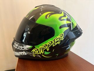 Casco integral SHOEI con un llamativo diseño inspirado en el Arlequín. Talla M. - Diseño gráfico multicolor. - Visera transparente. - Marca SHOEI visible.