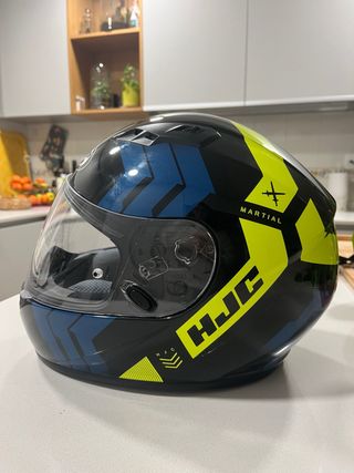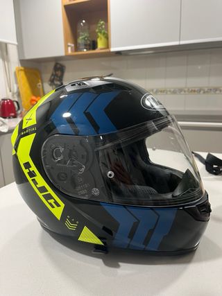 Casco integral HJC CS-15 con diseño llamativo. - Color negro con detalles en azul y amarillo neón. - Cierre de seguridad. - Visera transparente.