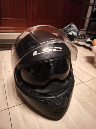 Casco integral LS2 negro mate con visor solar interior. Arañazos/marcas exteriores de uso (se ven en fotos) sin afectar al casco. Resto: uso normal. Talla por confirmar (S o M); a mí me queda como M. Sin intercom (Precio recomendado por wallapop 76€.) - Diseño aerodinámico. - Visera transparente. - Doble visor solar integrado.