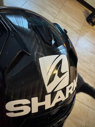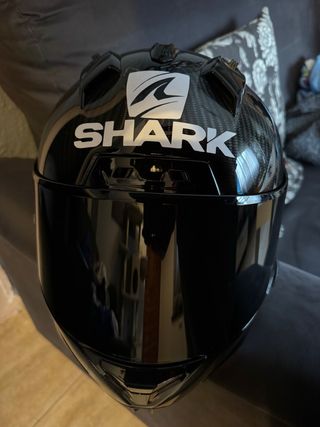 Casco integral Shark Race-R Pro GP en talla M. Diseño deportivo y aerodinámico. - Calota exterior de fibra de carbono. - Visera con tratamiento antivaho y antirrayas. - Interior desmontable y lavable. En la parte frontal tiene el brillo saltado por una piedra cuando iba circulando, el estado del casco es perfecto salvo eso, lo e usado muy poco ya que por estetica de moto llevo otro