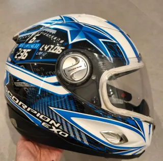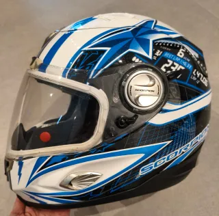Casco integral con calota de fibra modelo Scorpion EXO 1000 Air Speedster con un diseño deportivo en blanco y azul. Es una talla M / 58. - INCLUYE AIRBAG - INCLUYE VISERA SOLAR - Interior desmontable y lavable. En perfecto estado, muy poco uso. OPCIONAL GUANTES DEL MISMO USO.