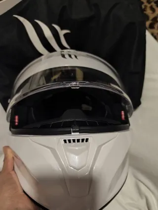 Casco modular nuevo fabricado en aluminio plástico inyectado. Me costó 355. Perfil compacto y aerodinámica que ofrece reducción del ruido. Talla M (57/58 cm). Peso: 1650 g (+/- 50 g) Cómodo interior en fibra de bambú Sistema Auto Up y Auto Down que permite el desbloqueo simultáneo de la pantalla y la mentonera en el momento de integral y jet Pantalla antirrayado con pinlock Max Vision (película antivaho) Sistema de desmontaje rápido y sin herramientas de la pantalla Cierre de la pantalla mediante sistema Auto - Color blanco con detalles en negro. - Visera transparente.