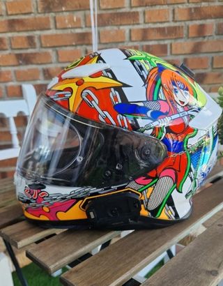 Casco integral MT Atom Axa con un llamativo diseño morado y decoraciones. E76815 - Diseño morado con detalles coloridos. - Visera transparente. -xs