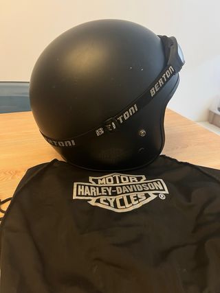 Casco Harley Davidson talla XL con gafas Bertoni incluidas. Ideal para rutas y para lucir un estilo único. - Casco integral negro. - Gafas Bertoni con banda ajustable. - Cierre de seguridad.