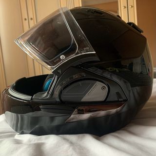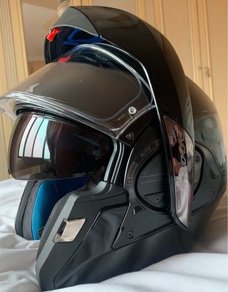 Casco de moto negro mate,tiene un pequeño arañazo en la parte izquierda. 0 Viseras transparente,con lentes interior antivaho Parasol tintado Material: carcasa de fibra de vidrio ultra TCT Cierre: doble D Peso aprox 1500g Forro de confort transpirable , desmontable y lavable. Con canal para gafas integrado Ventilación en la barbilla y en la parte superior de la cabeza, ajustable, así como ventilación en la parte posterior de la cabeza Sistema Airfit
