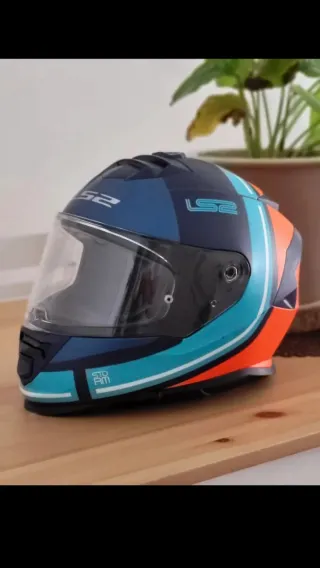 Casco integral LS2 STORM en talla M. Diseño moderno y seguro para tus viajes. Ninguna caída. El único desperfecto es arañazos laterales por la maleta de la moto. Es de policarbonato con interior desmontable para lavarlo. Cuenta con pinlock instalado que evita el vaho. Tiene un visor solar gafas de sol que se usa mediante una palanca. Ventilación frontal y superior cubrebarbilla de series. Cierre con correa de acero. Colores turquesa y naranja.