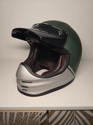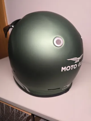 Casco integral para moto de la marca Guzzi, talla M. Diseño moderno y seguro. - Color verde y plateado. - Visera negra. - Interior cómodo.