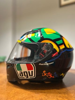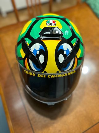 Casco integral AGV K-3 SV con diseño Rossi Tartaruga. Perfecto estado. Fue un regalo, sin usar. Talla ML 58cm Características principales: Calota exterior de resina HIR-TH (High Resistant Thermoplastic) pintada. 2 tamaños de calota exterior para un mejor ajuste a cada talla. Calota interior de EPS en 4 tamaños; dimensiones optimizadas utilizando FEM (Finite Element Analysis). Sistema de ventilación diseñado y optimizado en el túnel de viento, con 5 entradas de aire frontales y 2 extractores traseros. Pantalla clara de policarbonato antirayas y antivaho con 100% protección UV. XQRS (X-tra Quick Release System): mecanism
