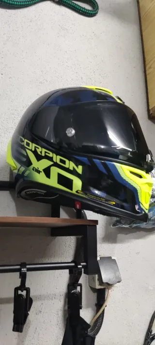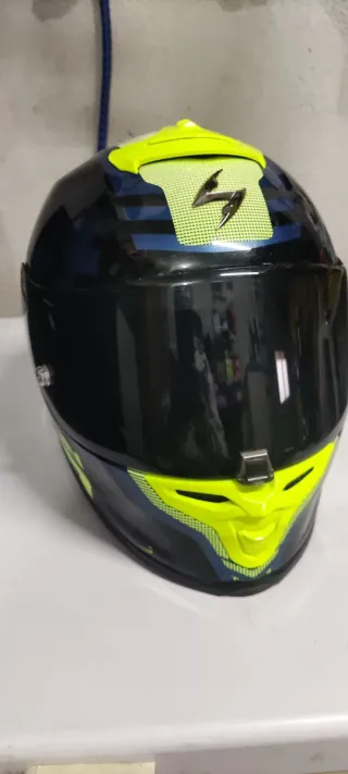 Casco integral Scorpion EXO R1 Air con un diseño llamativo. - Color principal negro con detalles en amarillo neón y azul. - Visera oscura. - Logo de Scorpion en la parte superior, talla S, Visera transparente, fundas para visera y casco, en su caja, se vende por cambio de moto, ideal para regalo