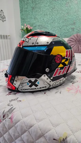 Casco integral Shark GP Pro con un diseño llamativo y moderno. - Visera oscura. - Detalles en plateado, rojo, azul y amarillo. - Inscripción CONTROLLERS en la parte frontal inferior.
