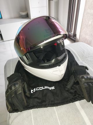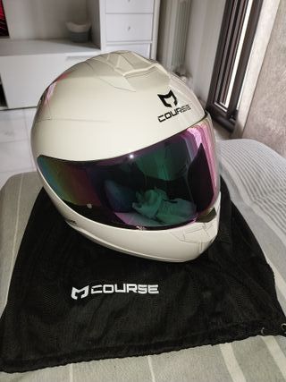 Casco integral para moto de la marca COURSE. - Color blanco. - Visera iridiscente. - Incluye funda protectora negra con logo COURSE.