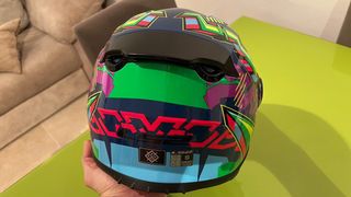 Casco integral LS2 para niño, talla S. Diseñado para ofrecer seguridad y comodidad en la moto. - Color principal azul con detalles en verde y morado. - Cierre de seguridad. - Interior cómodo y transpirable.