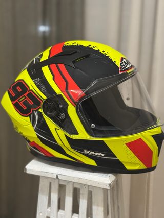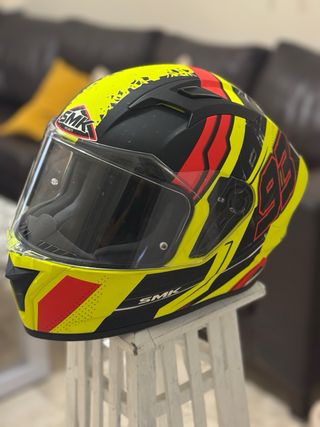Casco integral SMK con un diseño llamativo en amarillo, negro y detalles rojos. Muy poco uso, practicamente nuevo. Tiene funda de transporte - Talla S. - Diseño deportivo. - Visera transparente.