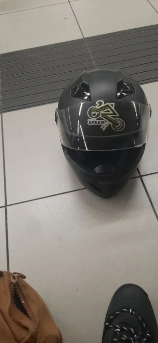 Casco integral de color negro, diseñado para ofrecer protección. - Visera transparente. - Adhesivo decorativo con diseño de moto y la palabra SPEED. Talla- M-
