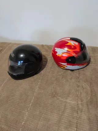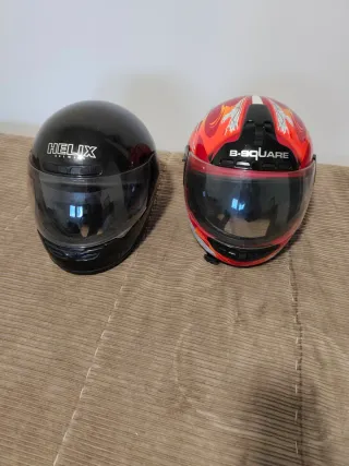 Se venden dos cascos integrales para moto, uno de la marca Helix y otro B-Square. - Casco Helix negro. - Casco B-Square rojo con diseño de llamas.