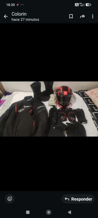 Conjunto completo de equipamiento para motociclismo. - Casco integral MT con diseño rojo y negro. - Chaqueta de moto Alpinestars negra con detalles naranjas. - Botas de moto negras. - Guantes de moto negros y rojos. - Pasamontañas negro.