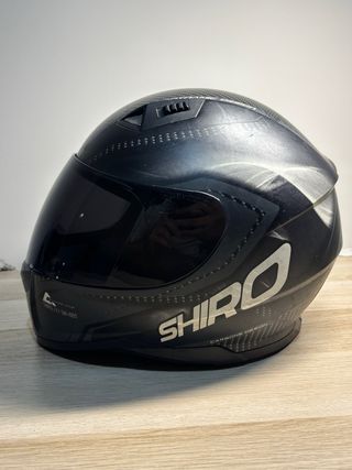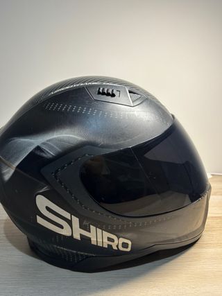 Casco integral Shiro SH-881 con diseño en negro y detalles plateados. - Diseño tipo carbono en la parte superior. - Visera oscura. - Visera transparente de recambio. - Inscripción SHIRO CARBONE DESIGN en el lateral. Funda para guardarlo. Talla M/L ( se borro la etiqueta y no puedo asegurar bien la talla ) se puede probar sin compromiso.