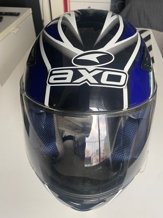 Casco integral AXO con diseño deportivo en negro, azul y blanco. Talla M. -Muy poco uso, por dentro perfecto solo pequeño detalles por fuera - Cierre de seguridad. - Visera transparente. - Interior acolchado.