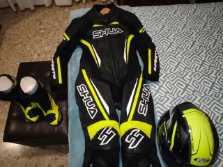 Conjunto completo para motociclismo de la marca SHUA. - Mono de cuero negro y amarillo. - Casco integral SHUA negro y amarillo. - Botas de moto SHUA negras y amarillas. - sotomono incluido Talla 40 de botas Solo tiene un desperfecto el casco en el regulador de plástico de la visera