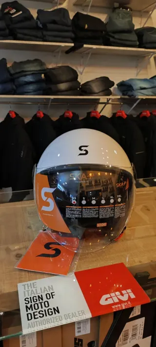 Casco de moto SKA-P, modelo 1Sha Zen, en color blanco brillo y talla XS. Diseño italiano. - Casco integral. - Visera transparente y gafas de sol. - Cierre de seguridad.