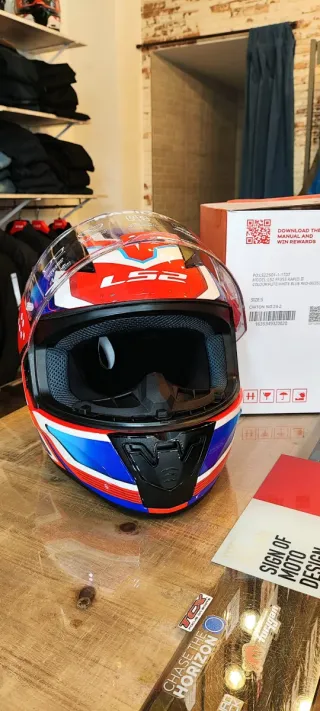 Casco integral LS2 FF353 Rapid II con diseño en blanco, azul y rojo. - Talla S. - Calota fabricada en policarbonato. - Visera con protección UV y anti-rayaduras. - Interior hipoalergénico y desmontable. - Preparado para Pinlock.