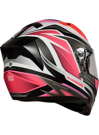 Casco de moto con un diseño llamativo y personalizado. - Color base negro con detalles gráficos en plateado y naranja. - Visera ajustable. - Cierre de seguridad.