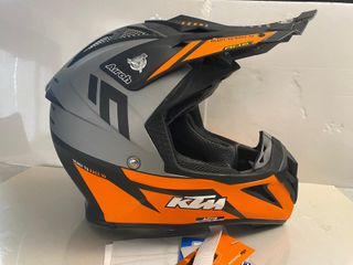NUEVO A ESTRENAR TENGO TALLA M,L,XL Casco KTM Comp Light para motocross y enduro. Diseño moderno y ligero. Peso: Aproximadamente 1.100 g (± 50 g), destacando por su ligereza. Construcción: Calota fabricada en una mezcla de carbono y fibra de vidrio con calota interna en EPS de doble densidad para mayor seguridad. Diseño: Borde inferior optimizado para su uso conjunto con protectores cervicales (Neck Brace). Ventilación: Visera ajustable con tornillos de aluminio y sistema de acolchados interiores extraíbles y lavables.
