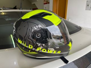 Casco de moto con diseño llamativo y colores vibrantes. - Diseño Wild Power con detalles gráficos. - Color principal negro con detalles en amarillo neón. - Visera transparente. - Cierre de seguridad. Usado 2 veces literalmente. Xxs