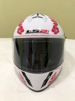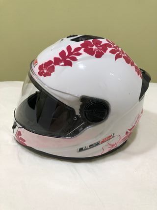 Casco de moto HJC en color blanco con detalles rosas, talla XS. 54 buen estado, poco uso. - Diseño deportivo. - Visera transparente. - Cierre de seguridad.