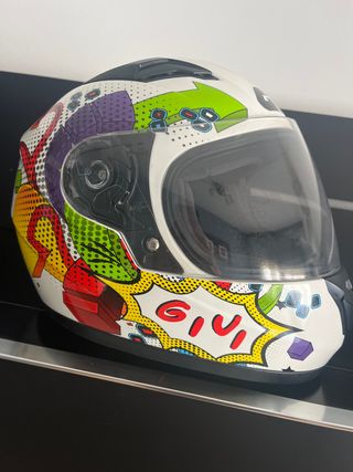 Casco integral para moto con un llamativo diseño inspirado en cómics. - Diseño Givi. - Estilo comic pop art. - Visera transparente.