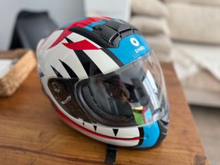 Casco infantil con un diseño llamativo y colorido. Talla YS. 4-6 años - Diseño tipo tiburón con detalles en rojo, blanco y azul. - Visera transparente. - Marca SHIRO.