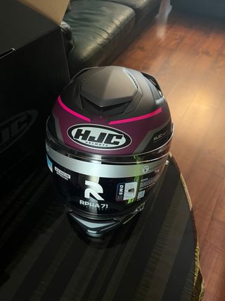 Casco HJC RPHA 71 Ellon en talla S, con un diseño en rosa y negro. - Diseño deportivo y aerodinámico. - Interior cómodo y transpirable. - Visera clara. - Cierre de doble anilla.