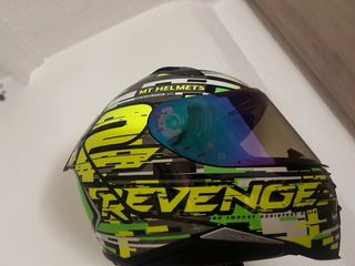 Casco de moto MT Revenge con un diseño llamativo y deportivo. - Diseño Revenge en colores verde lima y negro. - Sistema de cierre QRS (Quick Release System). - Visera con acabado iridiscente. - en su bolsa de transporte. Lo vendo por tener otro,usado dos veces.