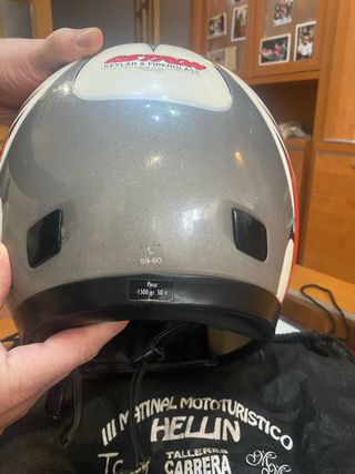 Casco de moto Nzi con fabricación en Kevlar y Fiberglass. - Talla L (59-60). - Peso aproximado de 1500 gr. ± 50 gr. - Incluye bolsa de transporte con logo National Mototuristico Hellin. - Homologación ECE 22.04.