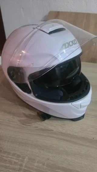 Casco de moto de la marca Axxis en talla L. Diseño moderno y seguro. - Color blanco. - Visera transparente. - Interior acolchado. Con gafas incorporadas