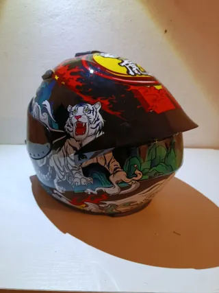 Casco de moto AGV con un diseño llamativo y divertido, inspirado en Valentino Rossi. - Diseño con personajes y onomatopeyas. - Colores vibrantes, principalmente amarillo. - Visera transparente. muy poco uso , como nuevo - Talla L ! precio no negociable