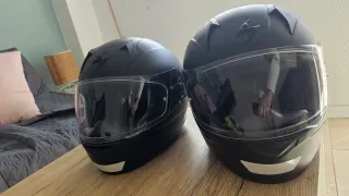 Casco de moto marca Scorpion modelo EXO en color negro. - Diseño deportivo. - Visera transparente. - Acabado mate. Uno de tamaño M y el otro L. El L solo fue usado un par de veces. El M un poco más pero no tiene ningun golpe (solo un pequeño rayon, ver foto)