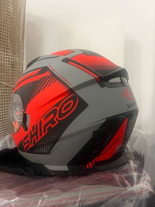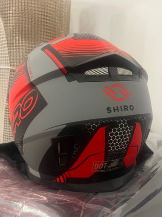 Casco de moto Shiro con un diseño moderno en gris y detalles en rojo. - Diseño con líneas y patrones geométricos. - Marca Shiro visible en la parte trasera. - Homologación DOT y ECE R22-05.