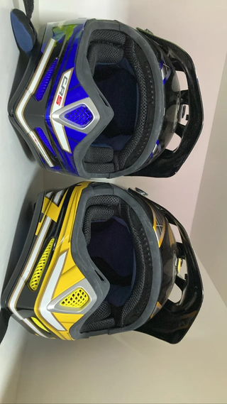 Dos cascos de protección para moto, ideales para motocross o enduro. Uno en color azul y negro, y otro en amarillo y negro. Incluye un peto de protección y unos guantes para moto. - Diseño deportivo. - Interior acolchado para mayor comodidad. - Visera integrada. ESTA TODO NUEVO, NO HACER OFERTAS ABSURDAS GRACIAS.