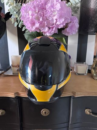 Casco de moto con un diseño llamativo y dinámico, vintage talla M - Base negra con detalles en amarillo, rojo y morado. - Visera transparente. - Ventilación frontal. - Años 90 muy poco uso (segundo casco)