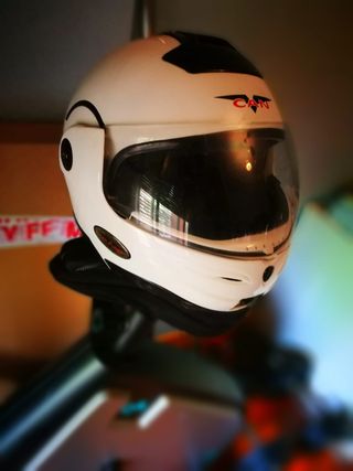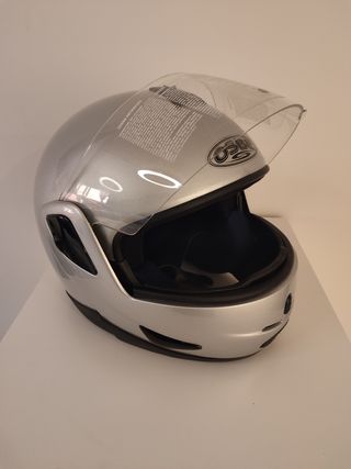 Casco de moto MT Helmets en buen estado. - Color plata. - Visera transparente. - Sistema de cierre micrométrico. - visera solar. - Mentonera abatible.