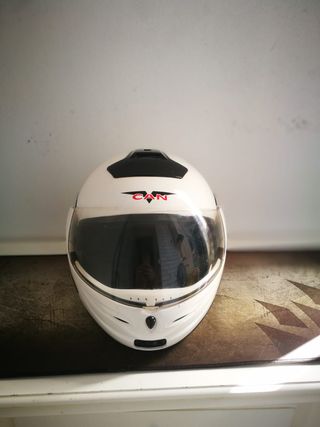 Casco de moto VCAN de color blanco con visor. - Diseño aerodinámico. - Visor transparente. - Logo de la marca VCAN en rojo y negro.