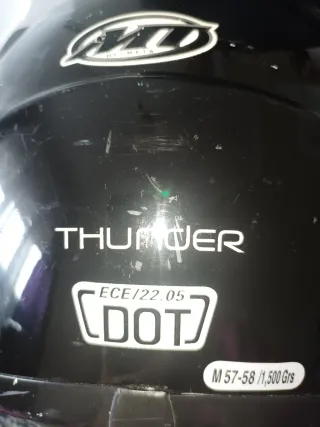 Casco de moto marca THUNDER con certificación DOT y ECE. - Talla M (57-58 cm). - Peso aproximado 1,500 gramos. - Diseño en color negro.