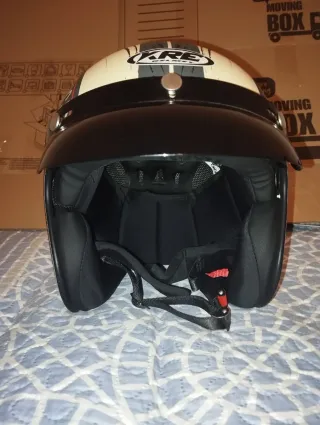 Casco de moto estilo retro con visera. - Diseño clásico en color crema y negro. - Detalle de rayas grises y logo KRE HELMETS. - Visera negra. - Interior acolchado y correas de sujeción.