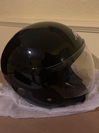 Casco de moto negro con visera transparente. Incluye funda protectora. Un solo uso. No es integral. - Diseño moderno. - Visera clara. - Funda de tela incluida.