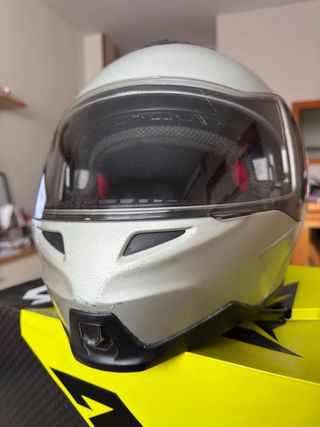 Casco de moto Unik en color blanco, tiene algunos desperfectos por fuera del uso pero lo demás está perfecto. - Talla: XS - Visera transparente incluida. - Cierre de correa con hebilla.
