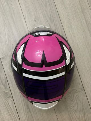 Casco de moto de color rosa. - Visera transparente. - Diseño abierto.