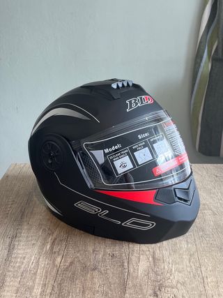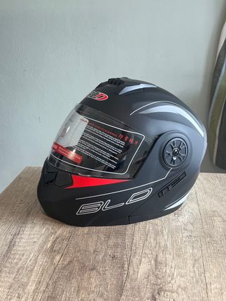 Casco de moto integral en color negro, con detalles en rojo y blanco. Incluye visor. - Visor con instrucciones de cuidado y limpieza. - Diseño aerodinámico. - Marca: BLD